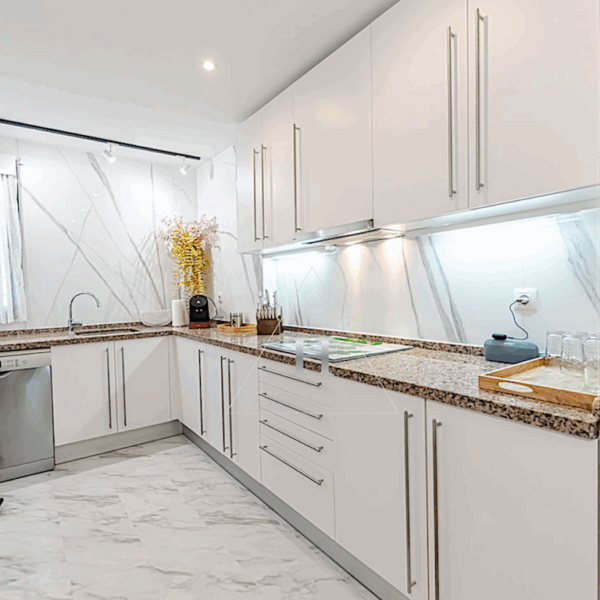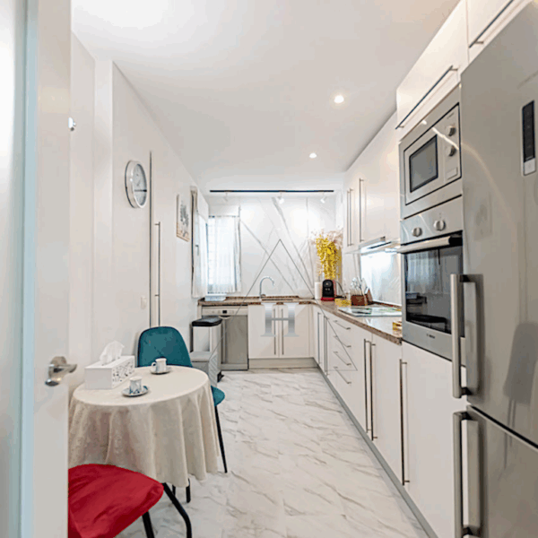 Are două dormitoare, ambele de dimensiuni bune, și două băi complete, plus un living spațios și confortabil. Bucătăria independentă, complet mobilată și echipată, are o zonă specială pentru mașina de spălat și uscător, oferind o mai mare funcționalitate.