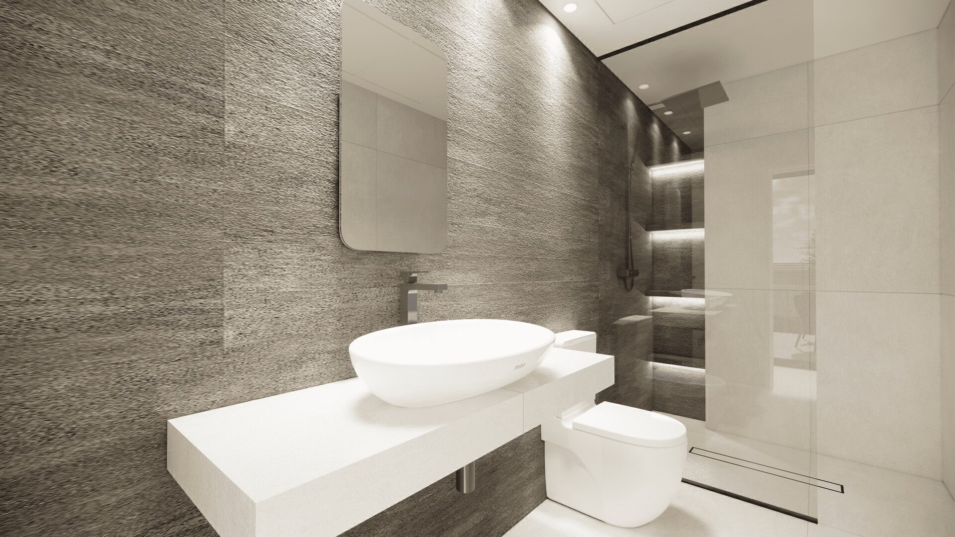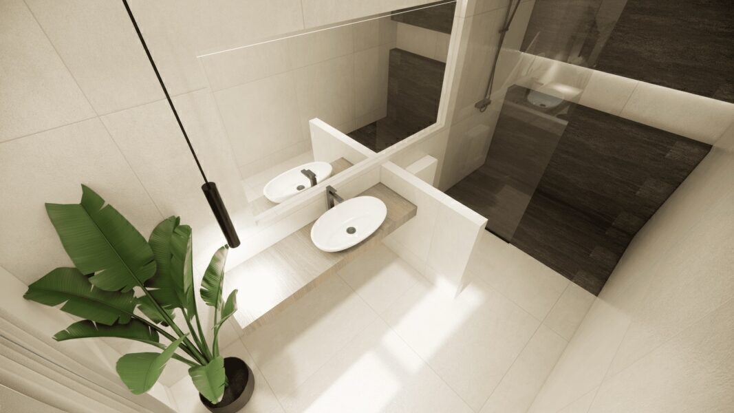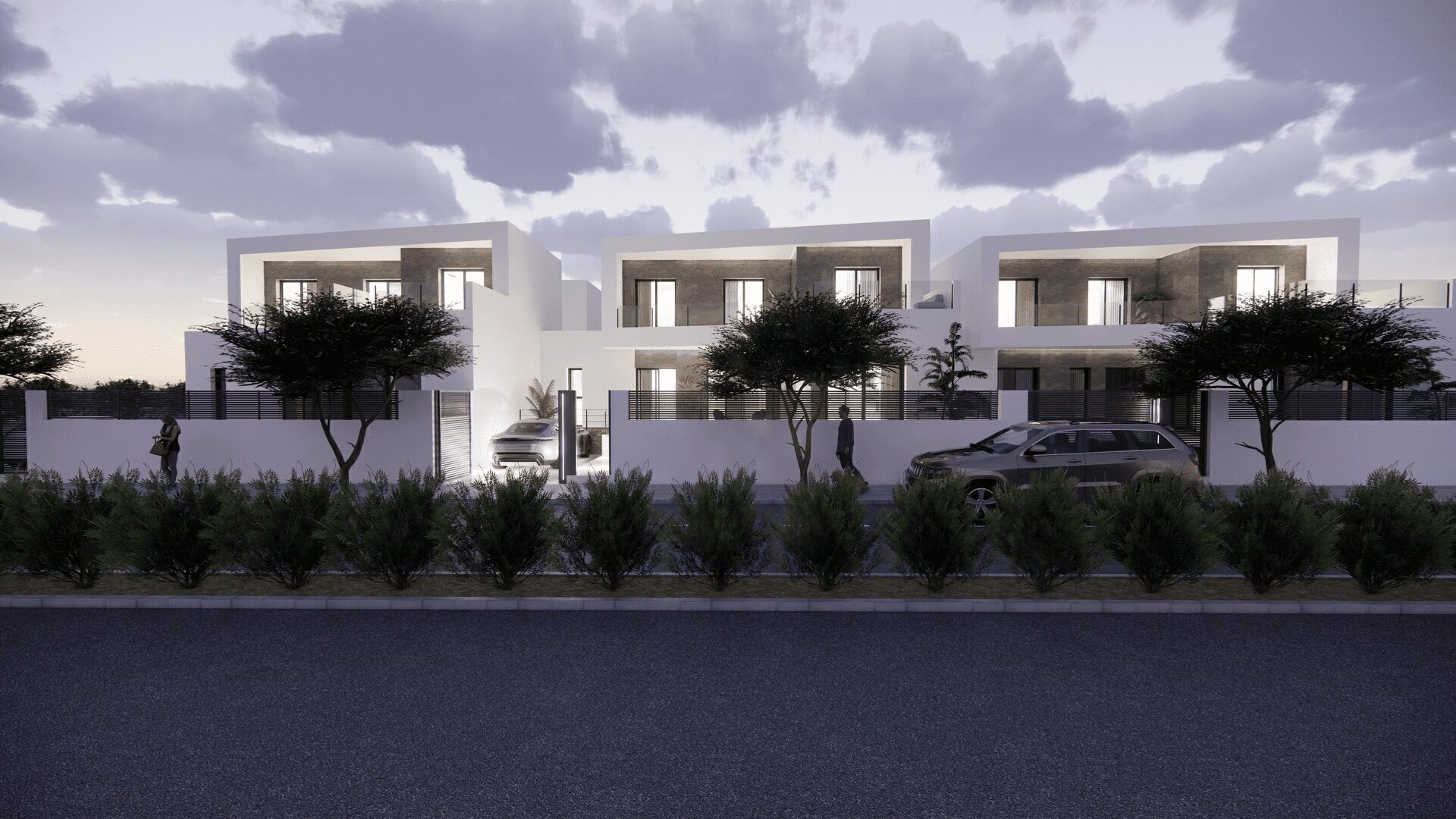 The interior of the townhouses is carefully designed to offer comfort and style. With three bedrooms and three bathrooms, each unit is equipped to meet the needs of families or couples seeking space and privacy. The porcelain tile floors add a modern touch and are easy to maintain, while the built-in wardrobes in the bedrooms offer practical and elegant storage solutions. The layout includes a garage, ensuring a secure space for the vehicle and additional storage.