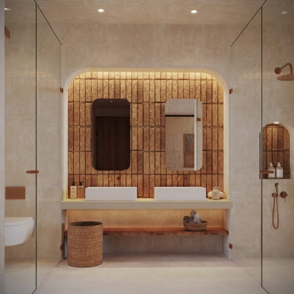 The interior of the villa is designed to offer comfort and functionality. It has three bedrooms, all with built-in wardrobes that optimize storage space. The four bathrooms are equipped with underfloor heating, ensuring optimal thermal comfort throughout the year. The kitchen is equipped with modern appliances, facilitating daily tasks and contributing to a practical and efficient lifestyle. The interior design focuses on spaciousness and brightness, creating a welcoming and elegant atmosphere.