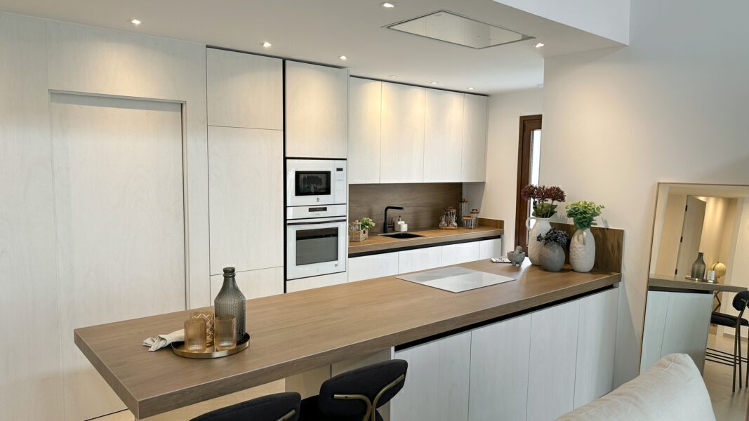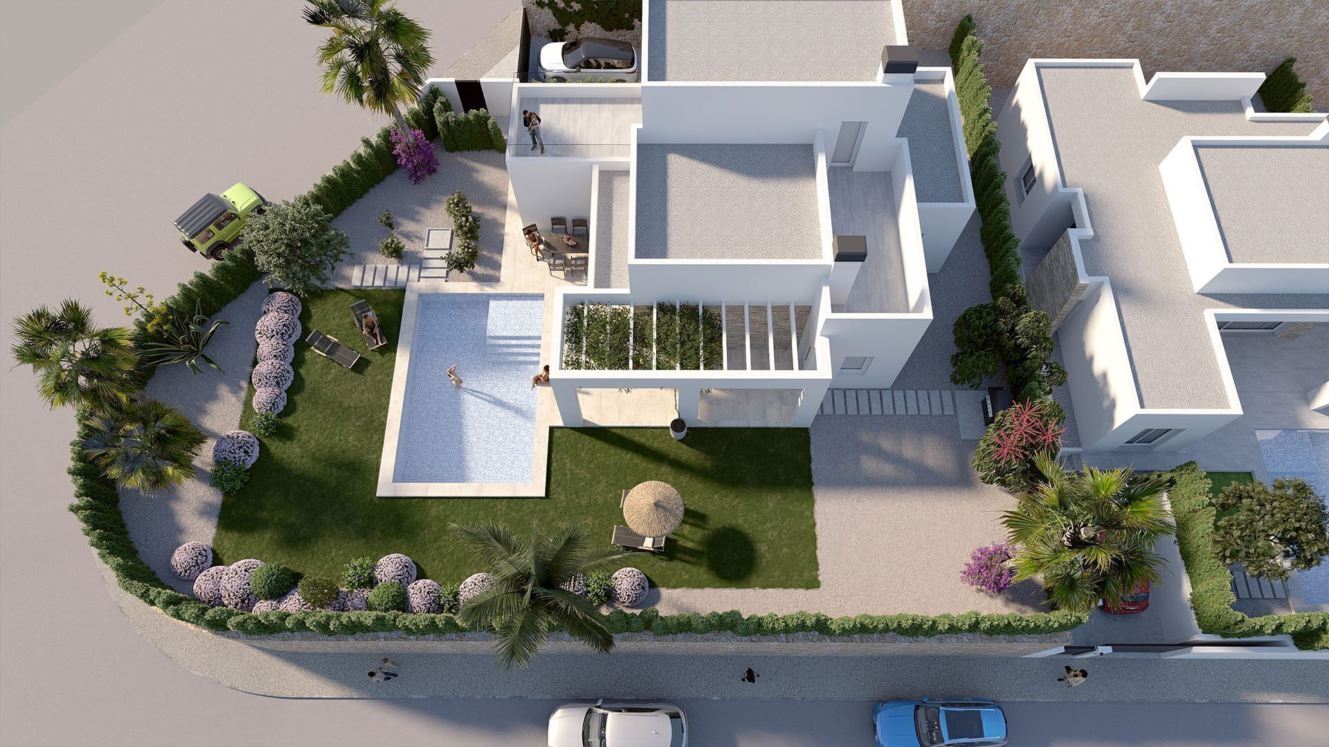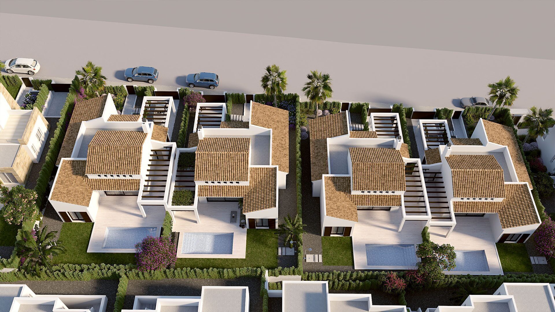 The exteriors of these homes have been designed to maximize enjoyment of the Mediterranean climate. Each property features a private garden, perfect for relaxing or enjoying outdoor activities. The spacious terraces offer an ideal space for al fresco dining or simply enjoying the views of the natural surroundings. Additionally, the homes include a solarium, providing an additional space for sunbathing in privacy. The inclusion of a private pool in each home adds a touch of luxury, allowing for refreshing dips on the hottest days. The presence of a pergola offers shade and a cozy space to rest.