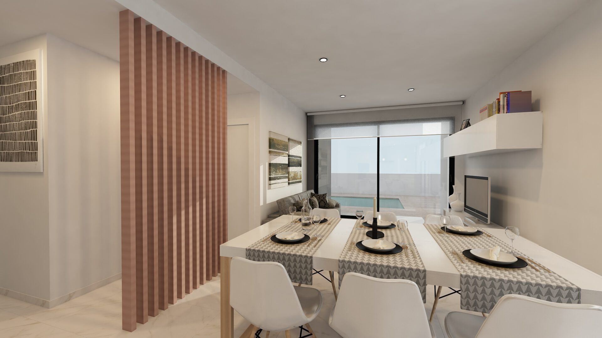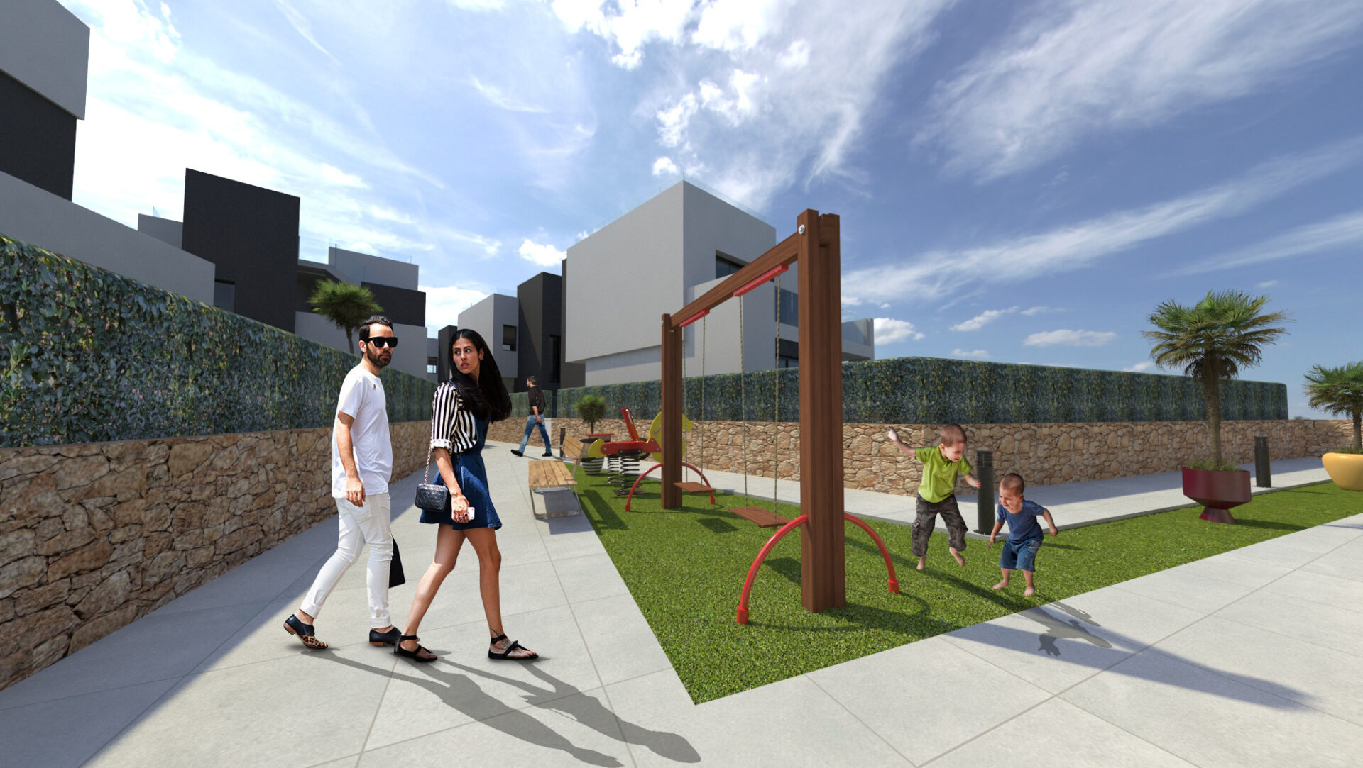 The homes feature outdoor spaces designed to enjoy the Mediterranean climate. Each property includes a private garden, perfect for creating a personal oasis of tranquility. Additionally, the terraces offer additional space for outdoor leisure, ideal for al fresco dining or relaxation moments. The presence of a solarium provides a privileged place to sunbathe and enjoy the surrounding views. For added convenience, each home has a private pool, allowing for a refreshing swim at any time.