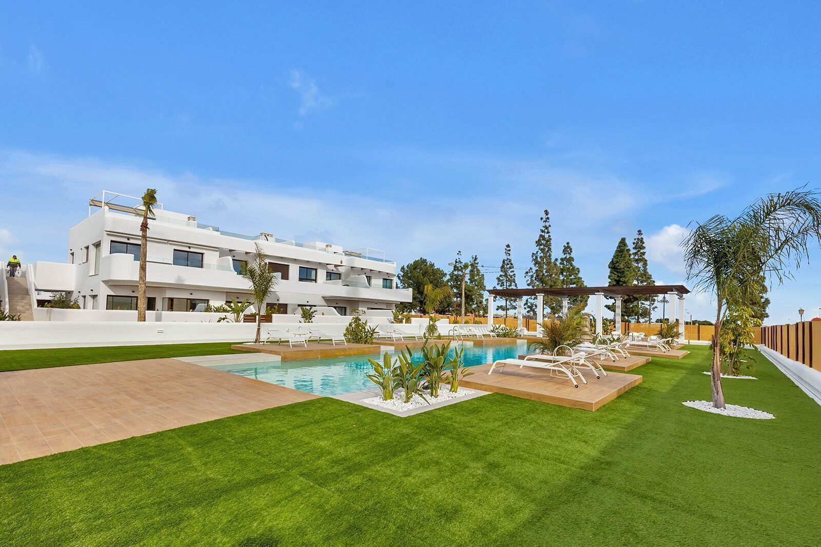 The exteriors of this residential complex are designed to complement the natural surroundings of Los Alcázares. The homes feature private terraces, perfect for enjoying the Mediterranean climate and surrounding views. Additionally, some properties offer the option of a solarium, providing extra outdoor space for relaxation or socializing. The communal gardens are carefully maintained, offering a green space where residents can enjoy the tranquility and beauty of the landscape. The proximity to the sea, just 1 km away, allows for coastal walks and water activities.