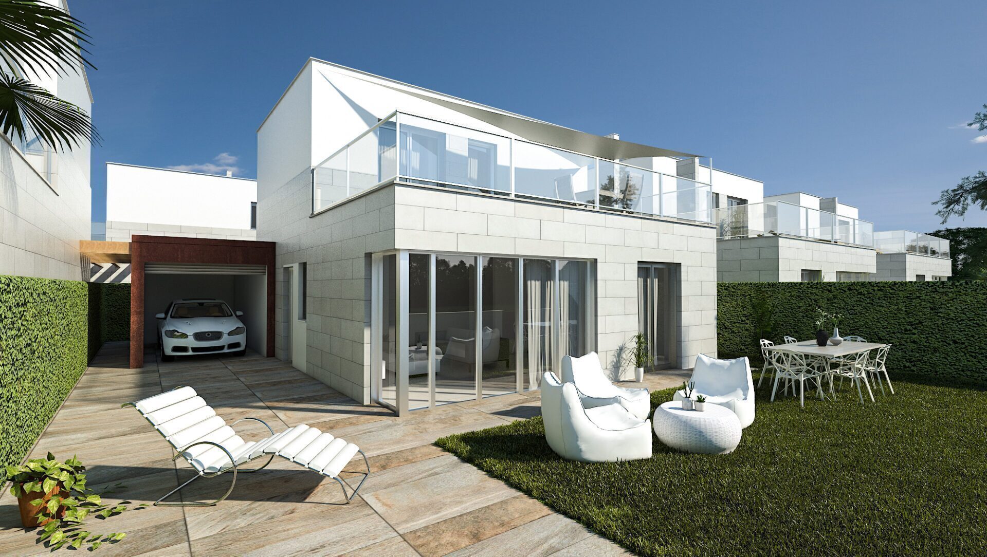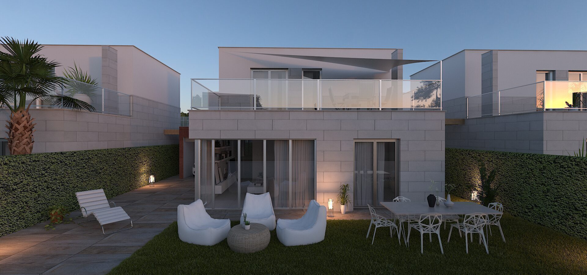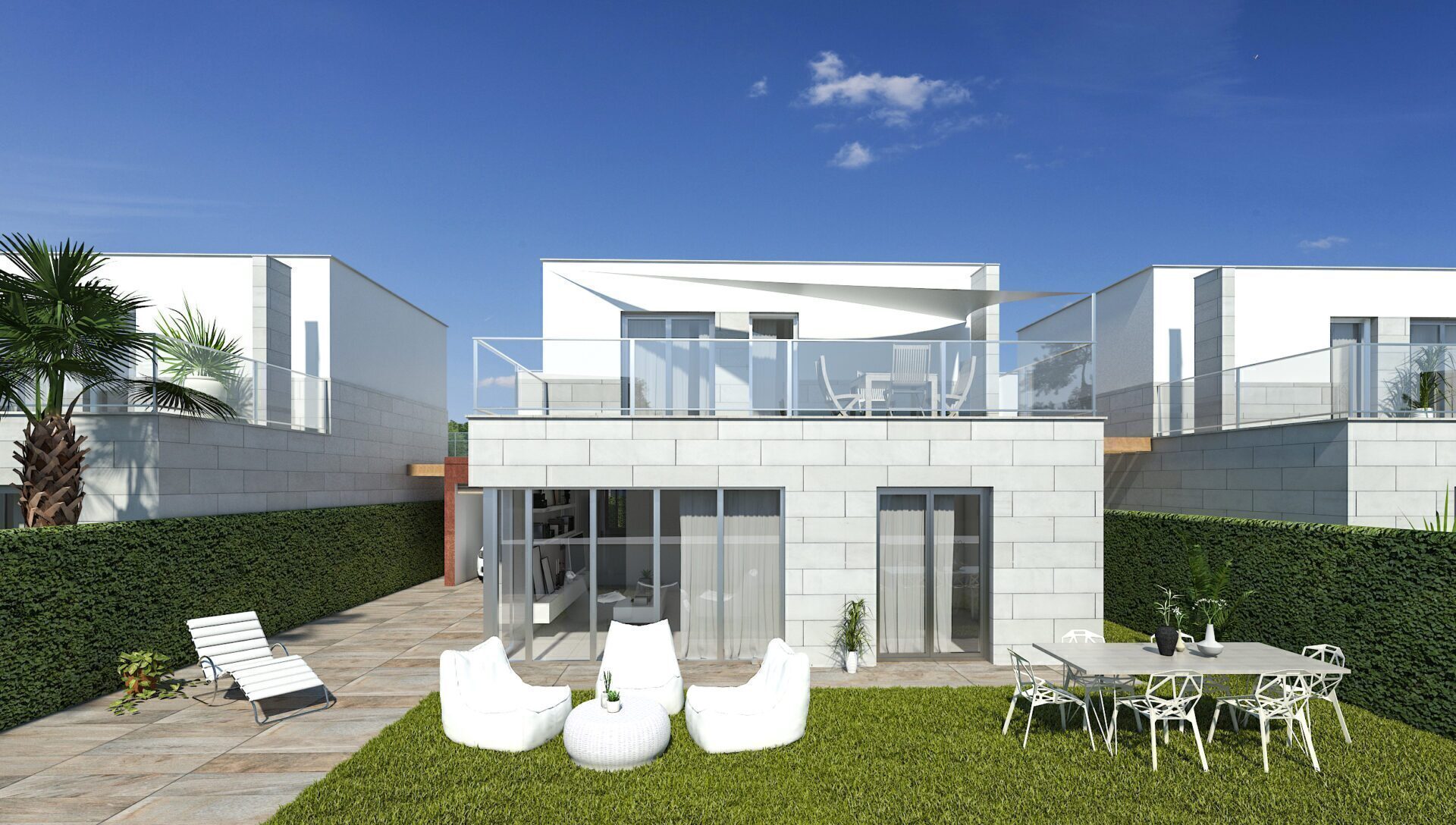 The exterior design of these detached homes in Los Alcázares focuses on integration with the natural environment and providing outdoor spaces that maximize enjoyment of the Mediterranean climate. Each property features a private garden, perfect for creating a personal oasis of tranquility or for enjoying outdoor gatherings. The terrace, an essential element in these homes, offers additional space for relaxation or dining al fresco, while the solarium provides an ideal spot for sunbathing in complete privacy. Proximity to the sea, just 1 km away, allows for unobstructed views and the enjoyment of the sea breeze, making the outdoors a perfect place for rest and leisure.