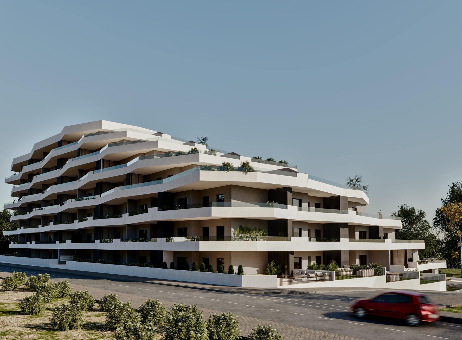 The exterior design of the properties in San Miguel de Salinas is intended to maximize enjoyment of the Mediterranean climate. Each home features a private garden, ideal for creating a personal green space or enjoying outdoor activities. The terraces offer a perfect place to relax and enjoy the views of the surroundings. Additionally, some types include a solarium, providing additional outdoor space where you can enjoy the sun year-round. The community also features landscaped areas, which not only beautify the environment but also offer a common space for all residents to enjoy.