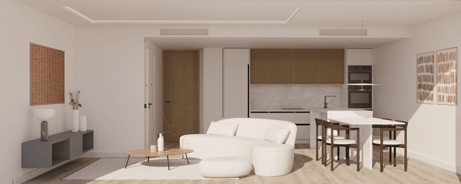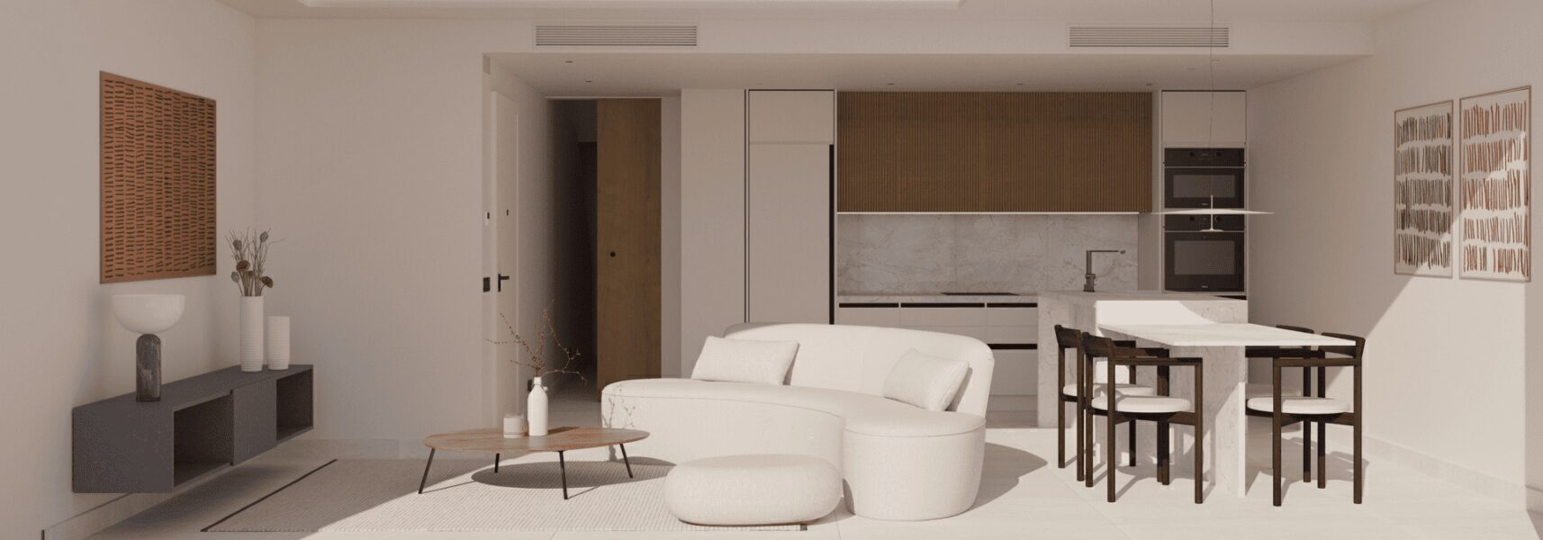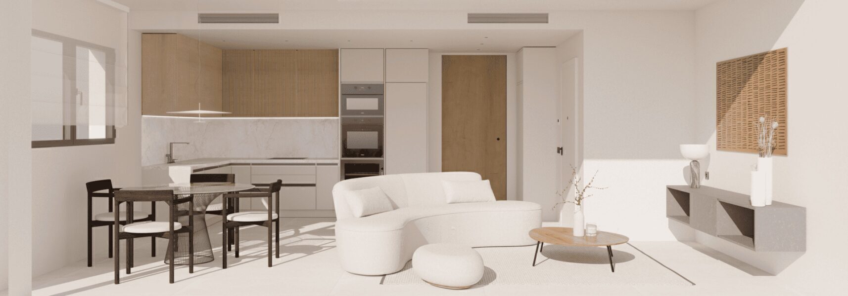The exteriors of these bungalows are designed to make the most of the Mediterranean climate. Each property features a private garden, ideal for enjoying outdoor moments. The spacious terraces offer additional space to relax or entertain guests, while the solarium provides a perfect spot to sunbathe in complete privacy. The proximity to the sea, just 1 km away, allows for panoramic views and the enjoyment of the sea breeze, creating a serene and refreshing atmosphere.