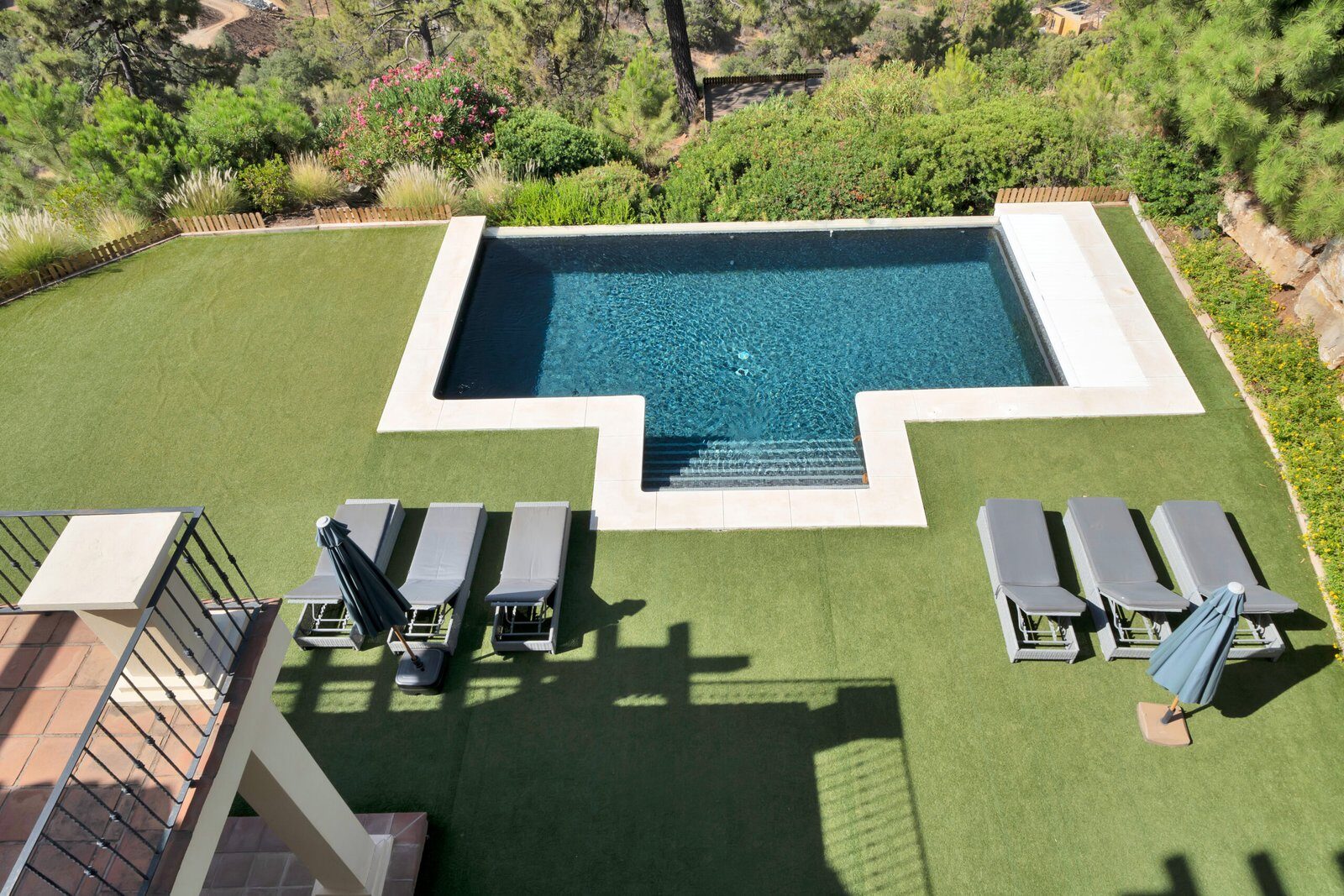 Unul dintre punctele de atracție ale acestei vile excepționale este piscina sa magnifică. Această oază privată, înconjurată de vegetație luxuriantă, combină apa sclipitoare cu priveliștile extinse, creând un mediu în care vă puteți relaxa și întineri complet. Indiferent dacă doriți să înotați, să faceți plajă sau doar să stați și să contemplați peisajul, acest spațiu în aer liber este o bijuterie care completează luxul vilei.