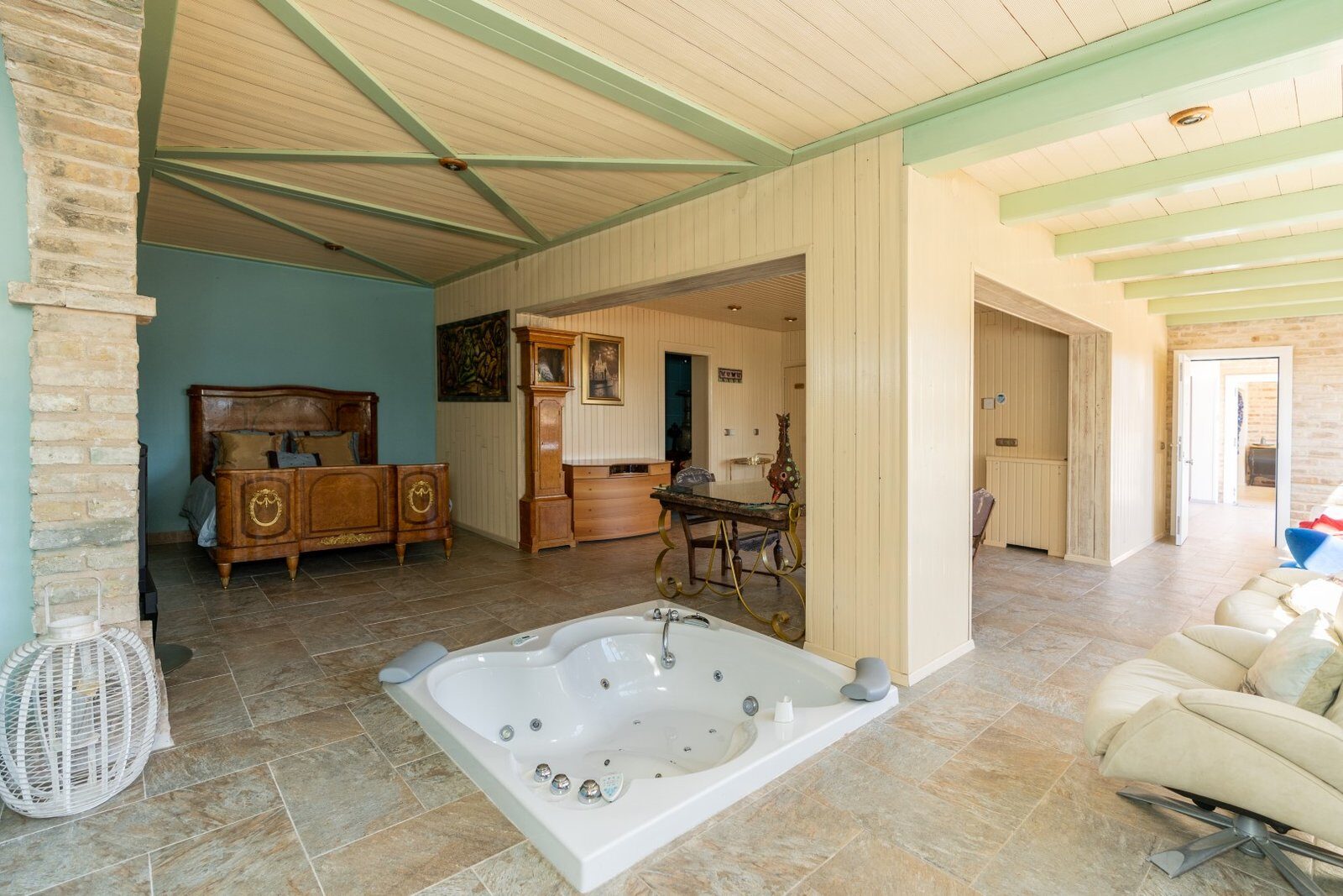 La același etaj, există trei dormitoare mari, fiecare cu baia proprie corespunzătoare, garantând intimitatea și confortul ocupanților săi. Bucătăria, dotată cu facilități moderne, include o zonă de luat masa și o cămară, facilitând pregătirea meselor într-un mediu practic și funcțional. Pentru cei care caută un spațiu de relaxare, vila găzduiește și o zonă SPA dotată cu jacuzzi, saună și baie de aburi, oferind astfel o experiență de wellness completă fără a fi nevoie să plece de acasă.
